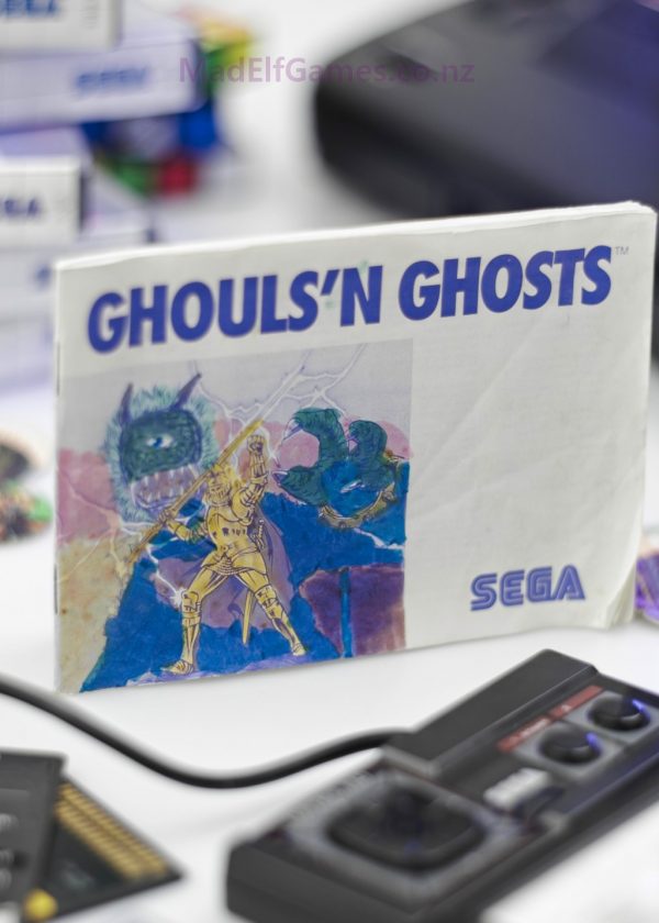 Ghouls ’n Ghosts for the Sega Master System brings Capcom’s notoriously difficult arcade classic to 8-bit, delivering a punishing but rewarding side-scrolling action experience. Players once again take control of Sir Arthur, the valiant knight, as he battles to save captured souls from the clutches of Lucifer and his monstrous army.