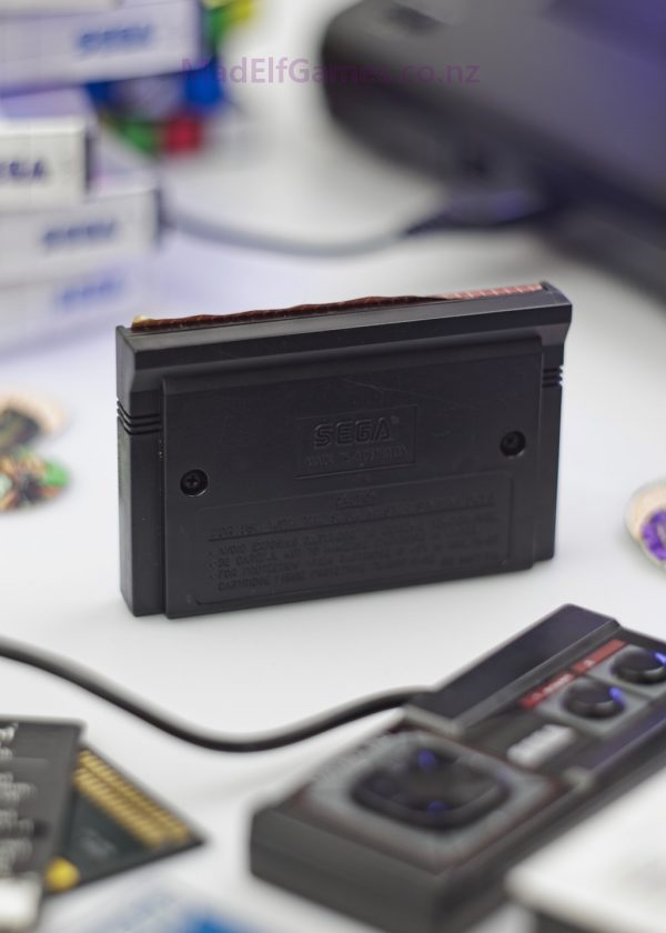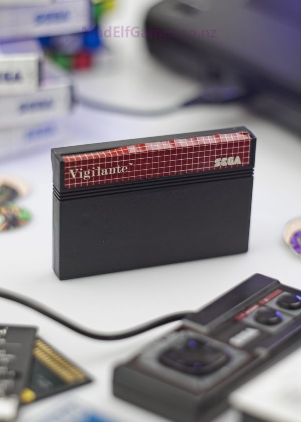 Vigilante on the Sega Master System distills urban beat ’em up tension into lean, side-scrolling stages. The goal is simple: walk forward, survive ambushes, and clear each zone to push deeper into gang territory. Enemies rush in waves, using grabs and surround tactics; your toolkit—punches, kicks, jump attacks, and occasional special weapons—rewards spacing and quick counterstrikes. Level art shifts from overpasses to dockyards and neon-washed blocks, each with distinct enemy mixes and pacing. Inputs are responsive, hit boxes fair, and audiovisual feedback crunchy enough to make every knockdown satisfying. Bosses escalate pressure with wider reach and tighter windows, encouraging cautious footwork over reckless charges. Minimal UI keeps focus on the fight, while a classic ’80s street-brawler tone seals the vibe. It’s straightforward, punchy combat—precise, challenging, and perfect for score-chasing runs.